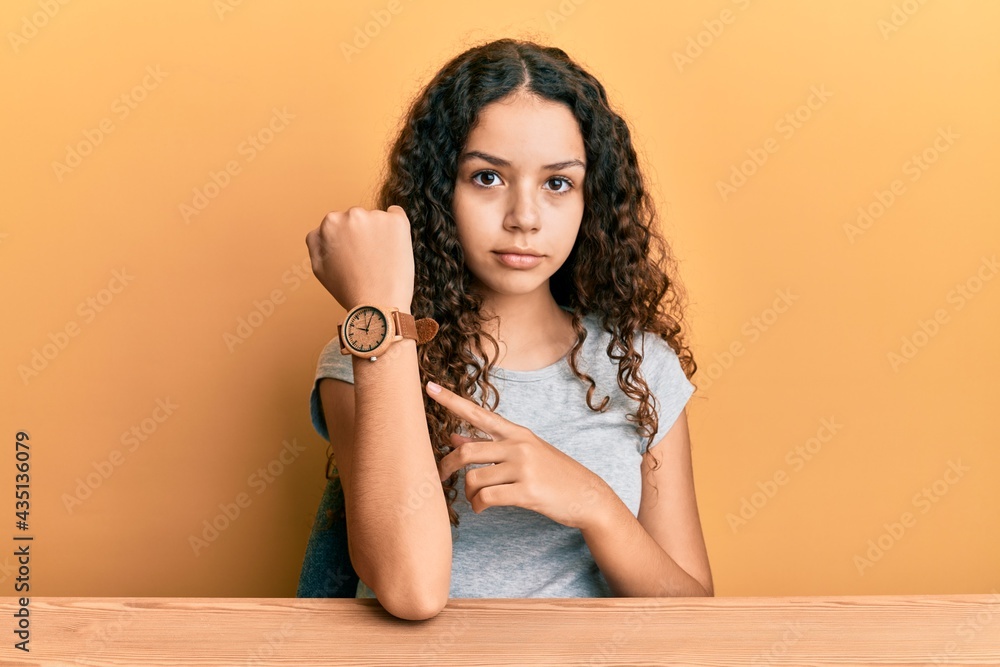 Teenager hispanic girl wearing casual clothes sitting on the table in hurry pointing to watch time, impatience, looking at the camera with relaxed expression