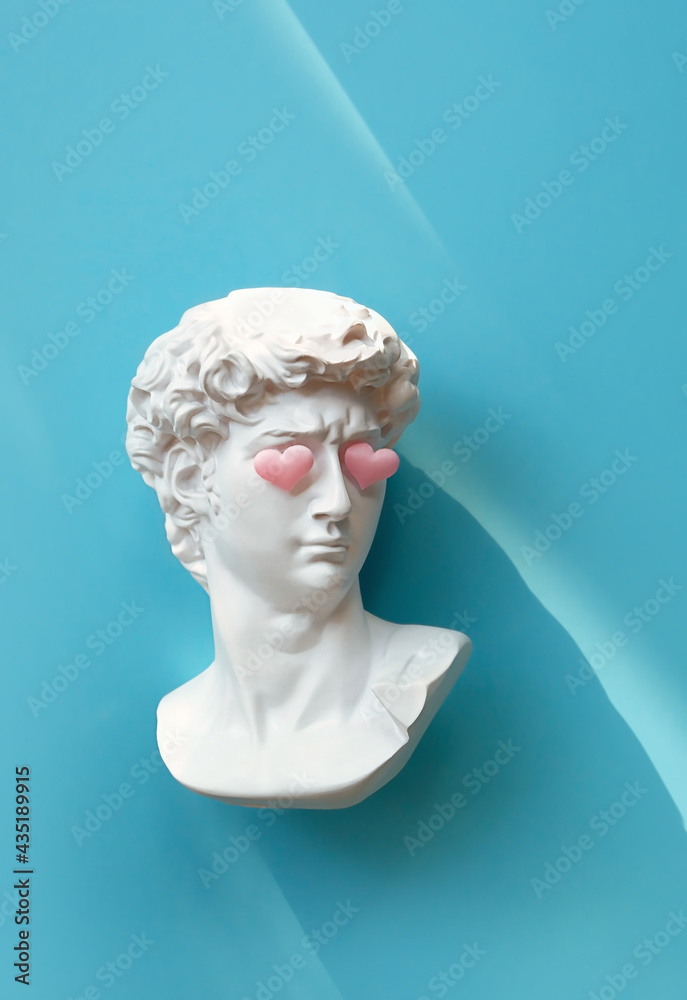 Plaster head of David with pink hearts on eyes, blue background. White sculpture of antique head in modern style. creative minimal art concept. flat lay