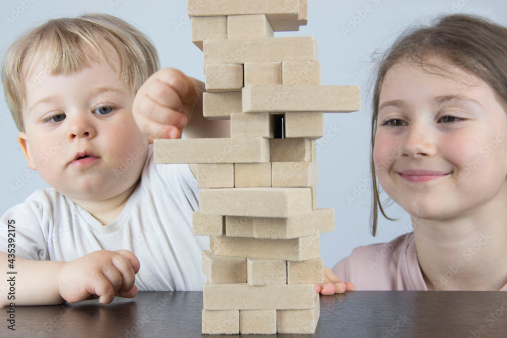 kids playing a game with wooden blocks, background concept of learning and development. risk and accurate decision - making.