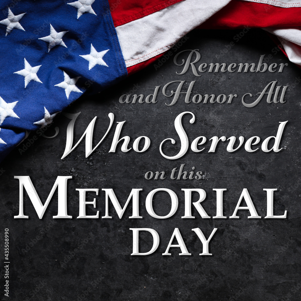 US American flag over Remember and Honor All Who Served on this Memorial Day Text. USA national holiday.