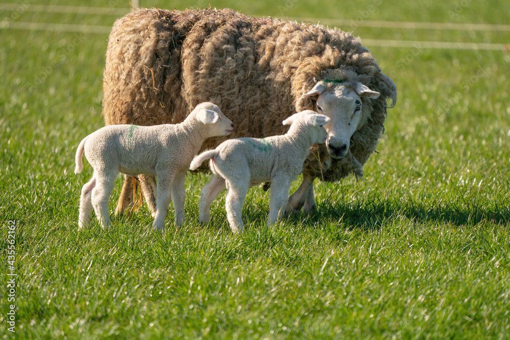 Mother sheep and her twin lambs are in fresh green grass. On a spring morning