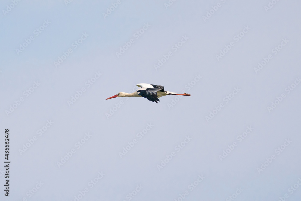 White stork flies against a blue sky with white clouds. Red beak and orange legs. Copy space