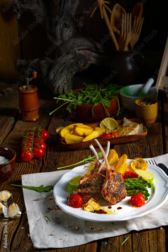 Lamb chops marinated in herbs with green asparagus and lime