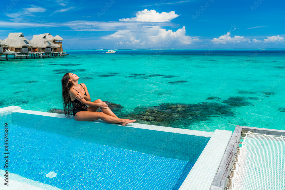 Luxury resort vacation travel woman sunbathing by overwater bungalow swimming pool in Bora Bora, French Polynesia. Elegant happy Asian beauty swimsuit model smooth skin legs at wellness spa hotel.