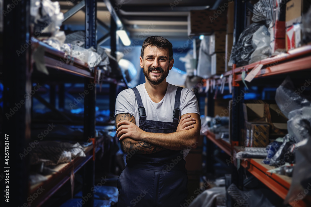 Young smiling happy tattooed bearded worker in overalls standing in storage of import and export firm with arms crossed.