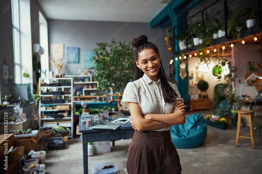 Pretty florist with cornrows looking in front of her