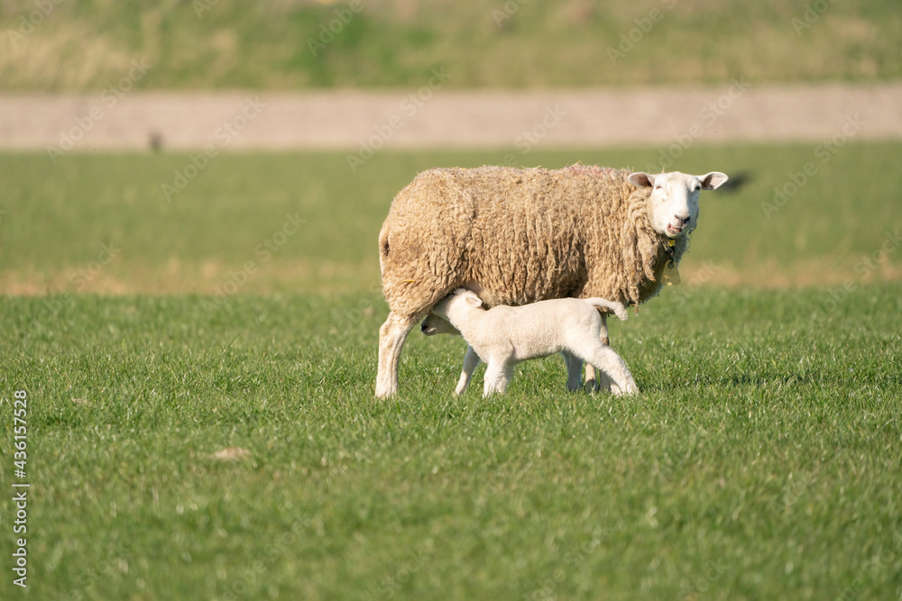 Mother sheep and her twin lambs drinking milk from the ewe. On a spring morning