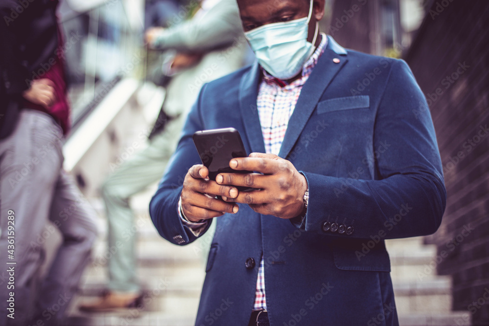 Three business men outside. African businessman typing on phone. Focus is on African man.