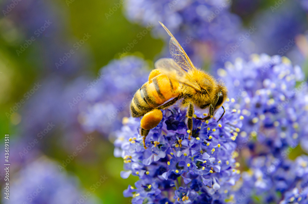 Close up of a honey bee on ceanothus or California Lilac flowers