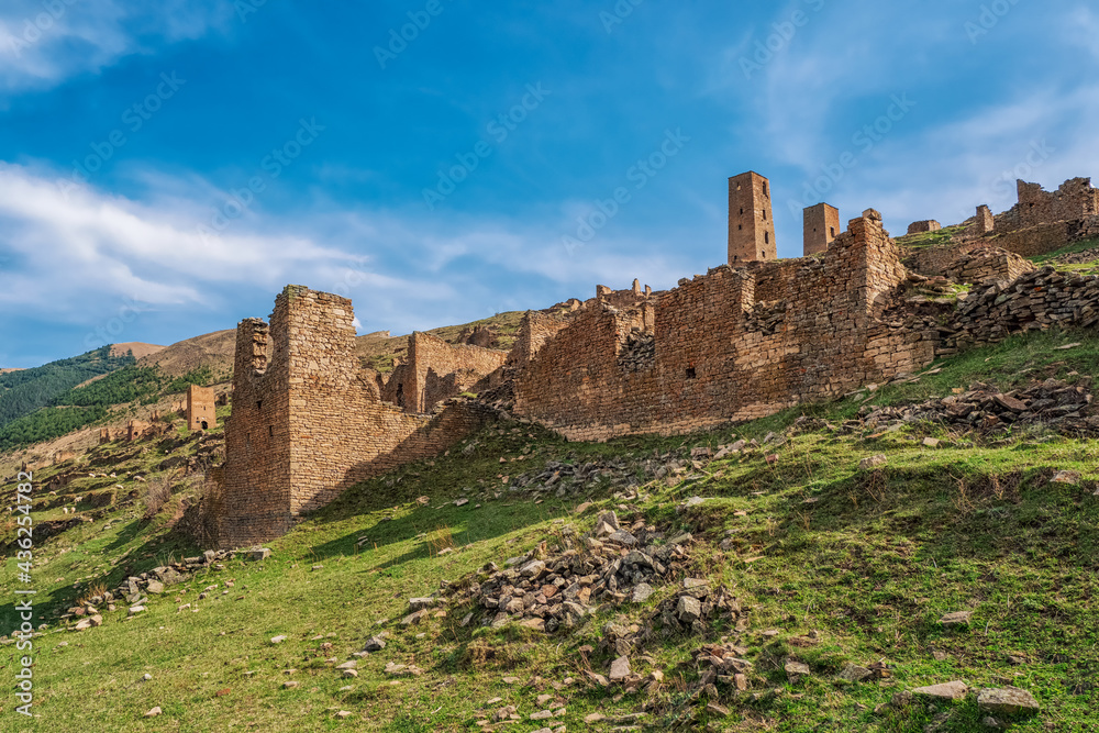 Summer panoramic view of ruins and towers of the aul ghost Goor in Dagestan in the evening light.