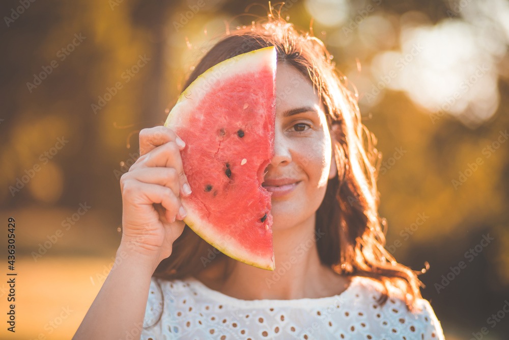 Woman holding slice of watermelon in nature. Fruit for your beauty.