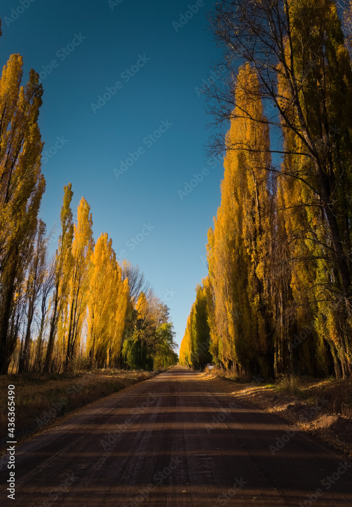 Dirt road lined by yellow poplar trees on an autumn afternoon in Uspallata, province of Mendoza, Argentina.