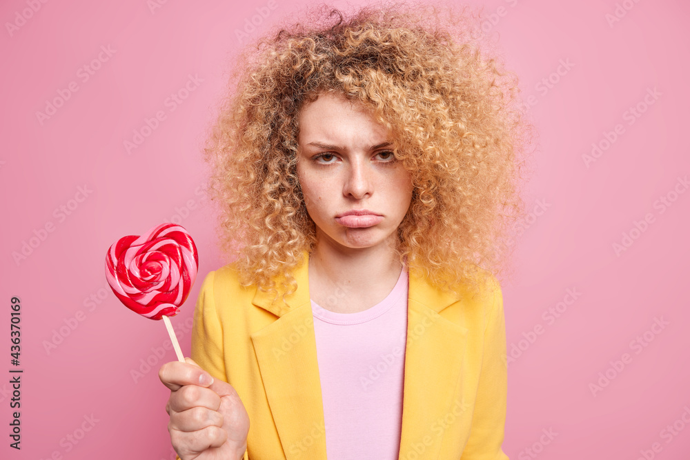 Sad frustrated curly haired woman has sweet tooth holds candy on stick cannot afford eating it has bad mood dressed in yellow jacket isolated over pink background. Upset female with lollipop