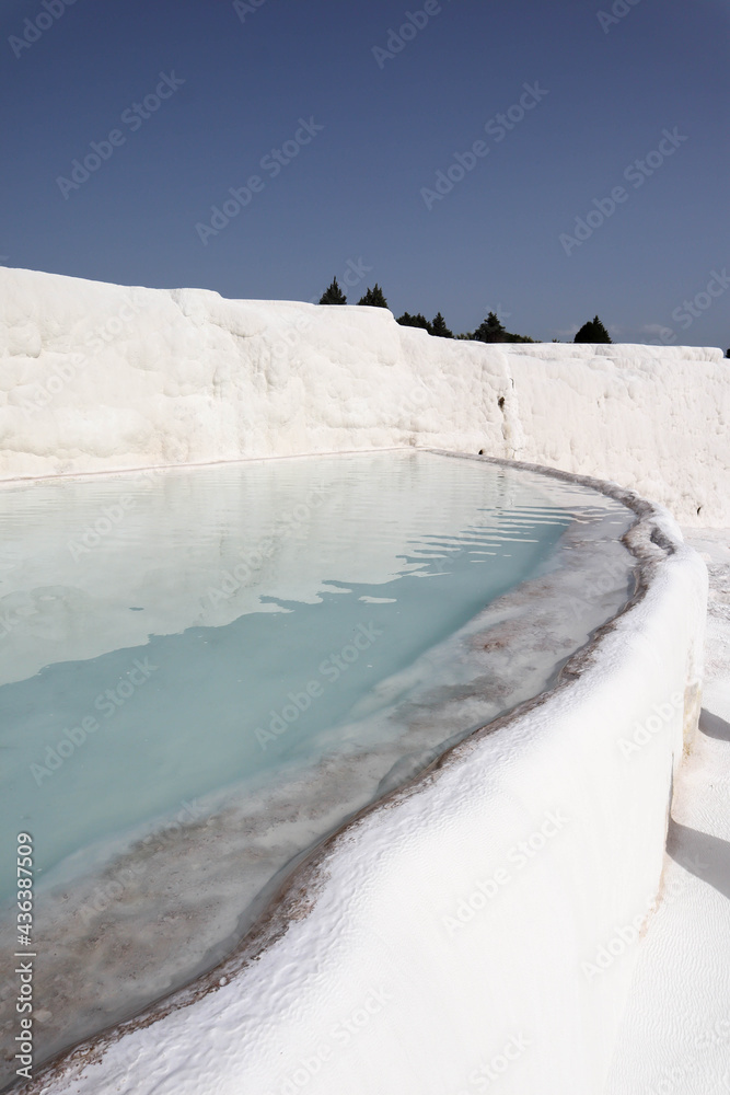 scenic view - azure water from thermal hot springs in white limestone pools travertine in Pamukkale, Turkey