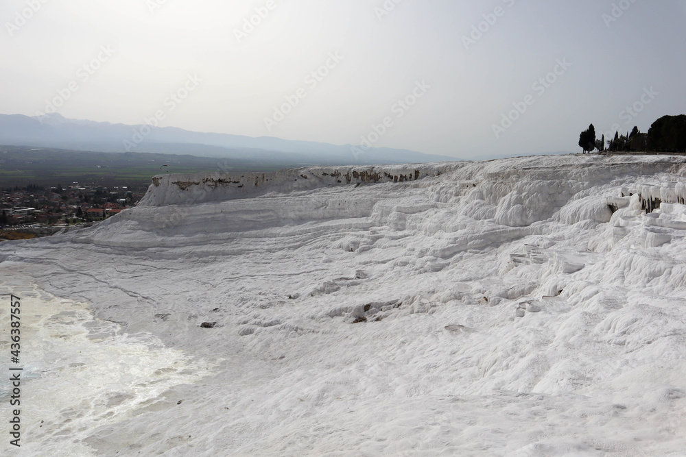 slopes of the valley covered by white carbonate mineral formations, travertines of Pamukkale, Turkey
