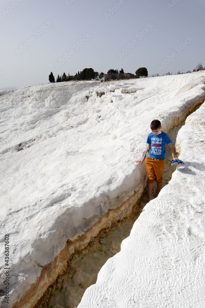 young boy explore Pamukkale white limestone travertines and enjoy warm mineral water