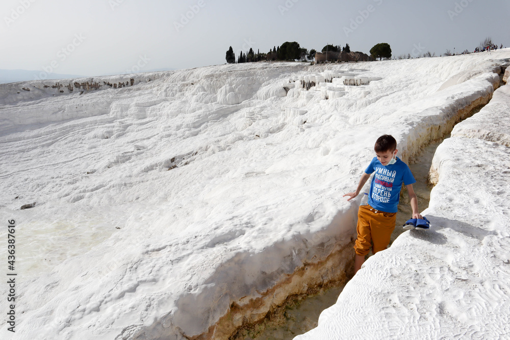 young boy explore Pamukkale white limestone travertines and enjoy warm mineral water