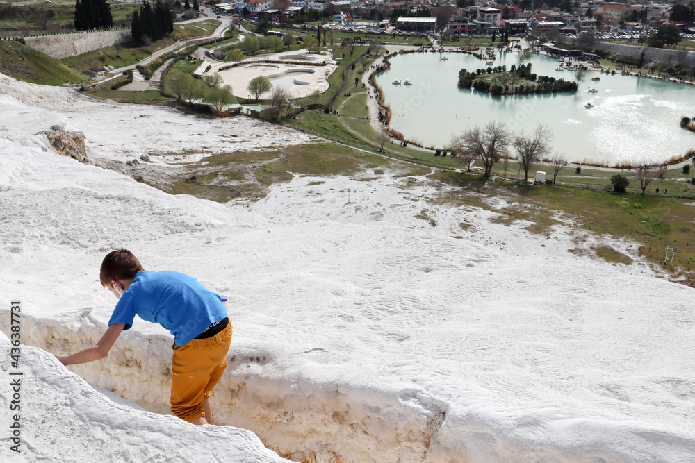 young boy explore Pamukkale white limestone travertines and enjoy warm mineral water