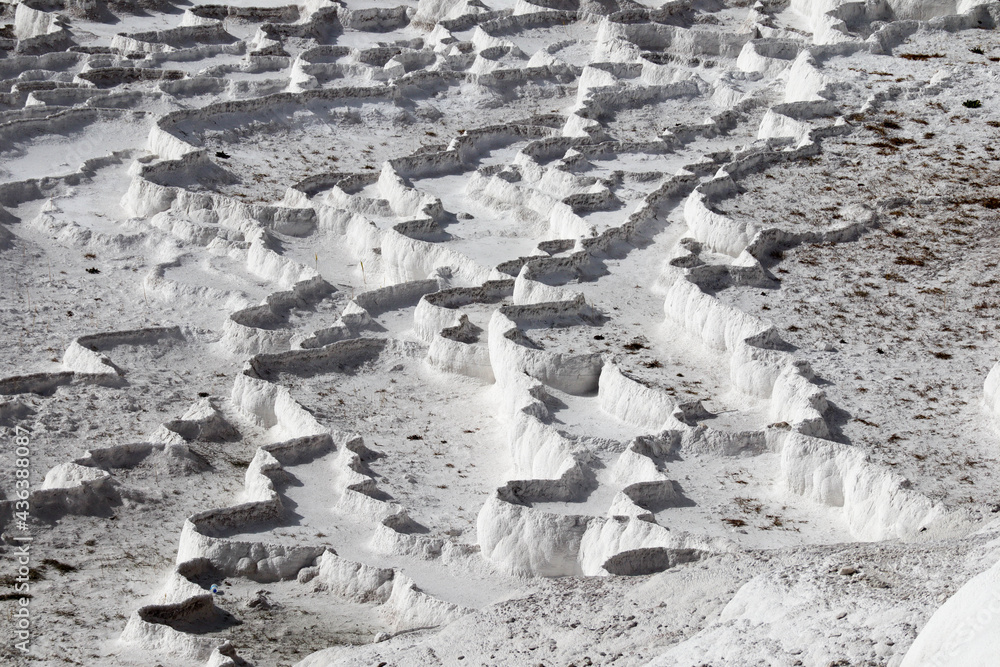 beautiful white fields of carbonated limestone formations in Pamukkale, Turkey