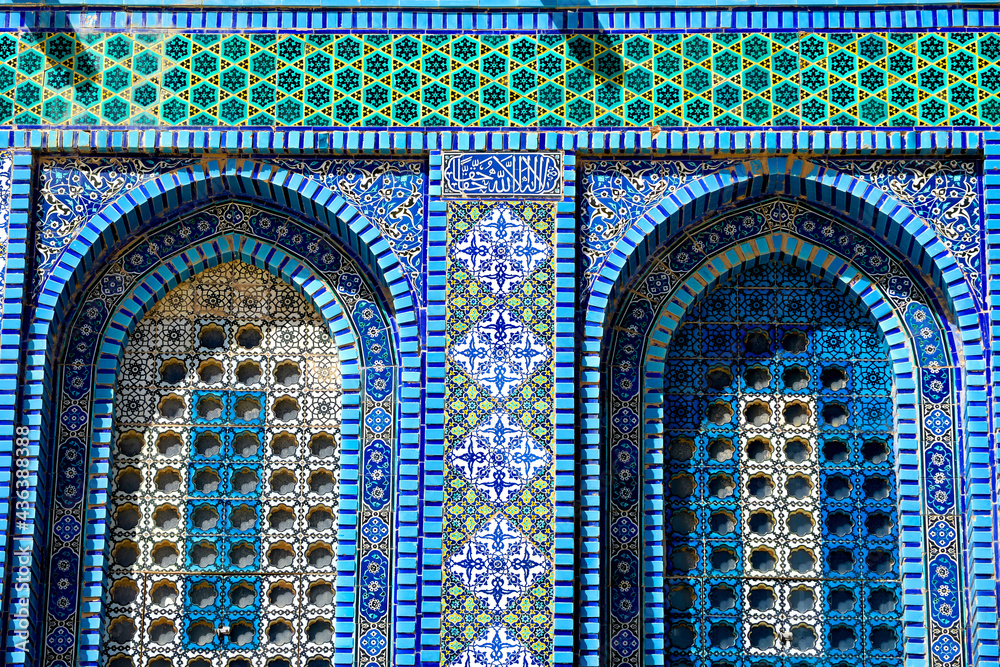 Detail of arabic mosaic with glazed ceramic tiles in byzantine style in the Dome of The Rock, an Islamic shrine the Old City of Jerusalem, Israe