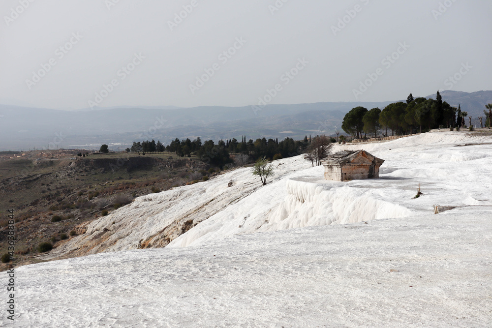 ancient hellenic tomb submerged in travertine pool in Hierapolis, Pamukkale in Turkey scenic view