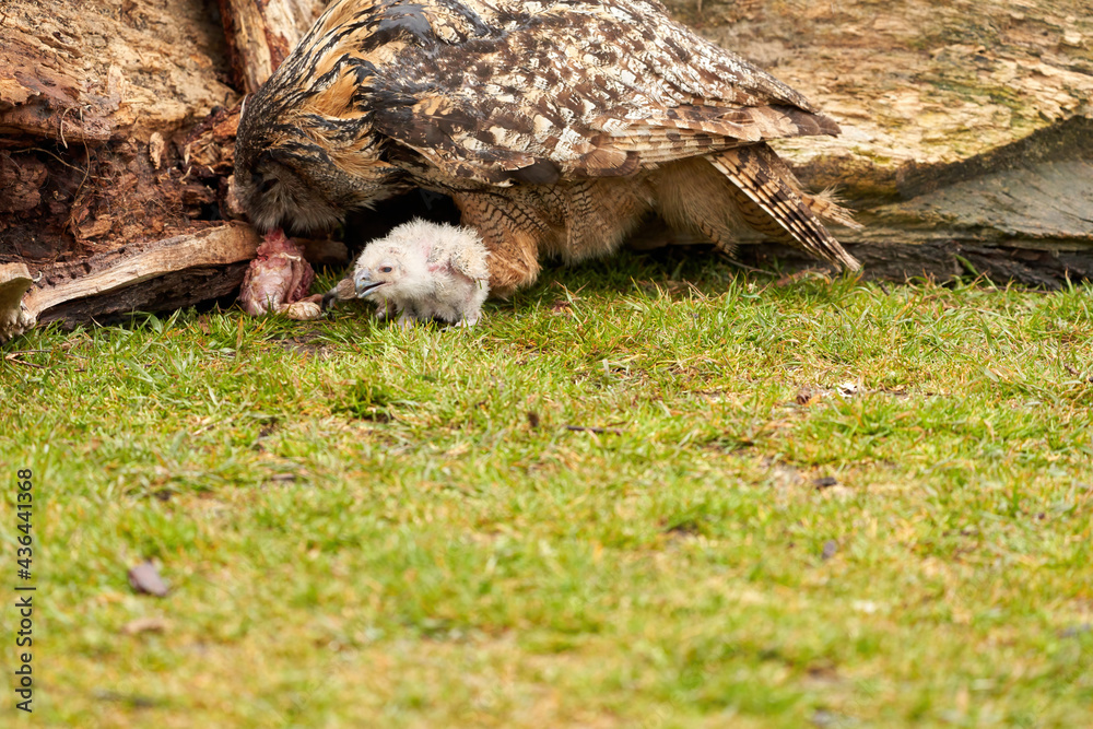 Wild eagle owl mother feeds a chick. The six-week-old white owl is still unstable on its feet in the grass. Part of mother