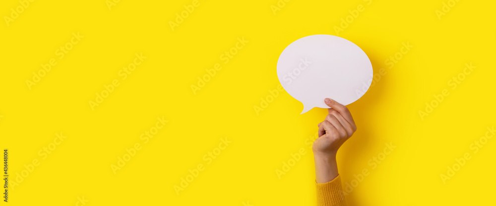 bubble speech layout in hand over yellow background, panoramic mock-up