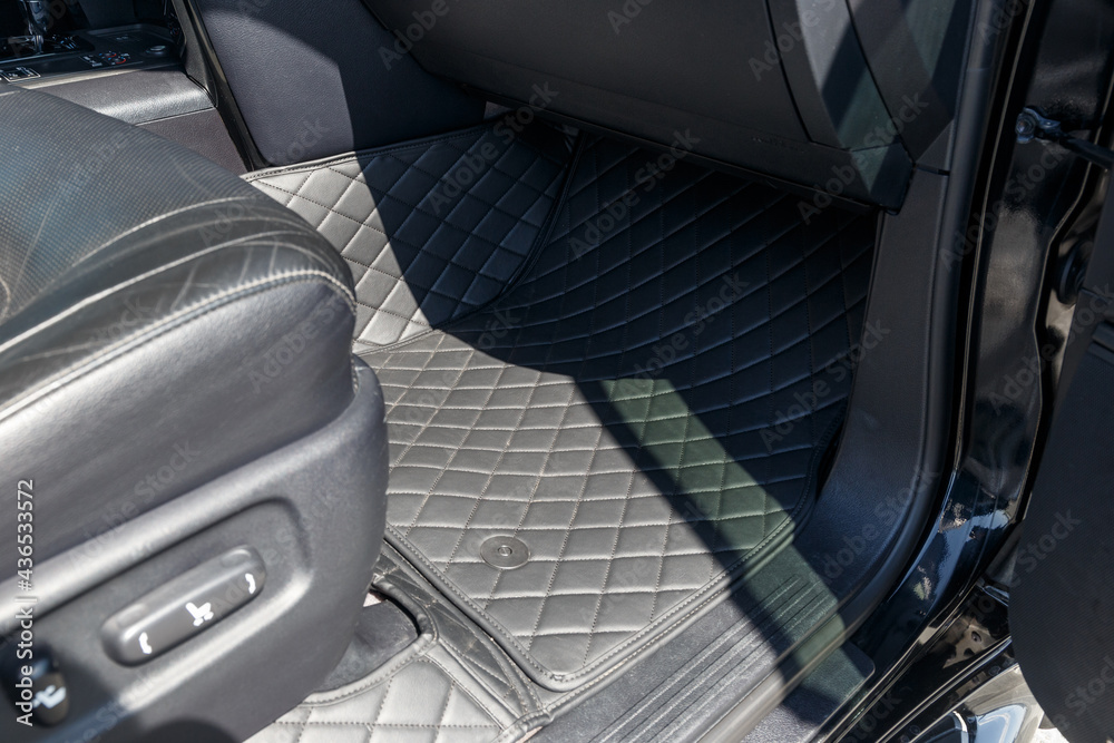 Close-up car floor mats of luxury leather, interior trim with white diamond stitching. Trim stitching. Car interior. Soft focus. Car detail