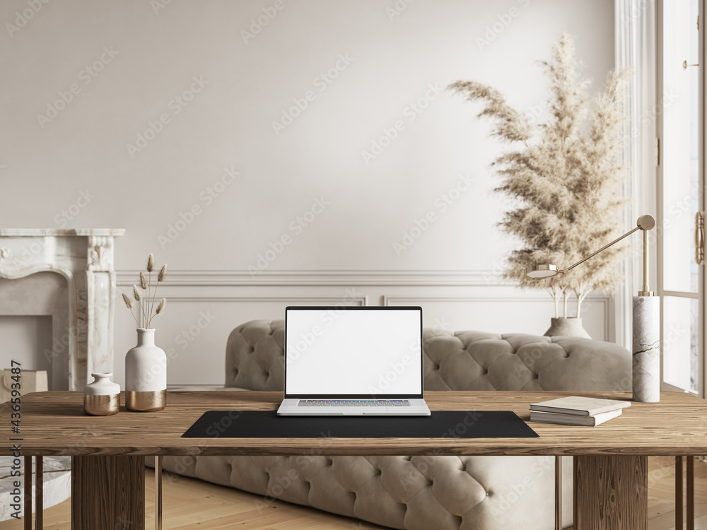 Workspace notebook computer, monitor on bright classic interior. 3d render illustration mock up.