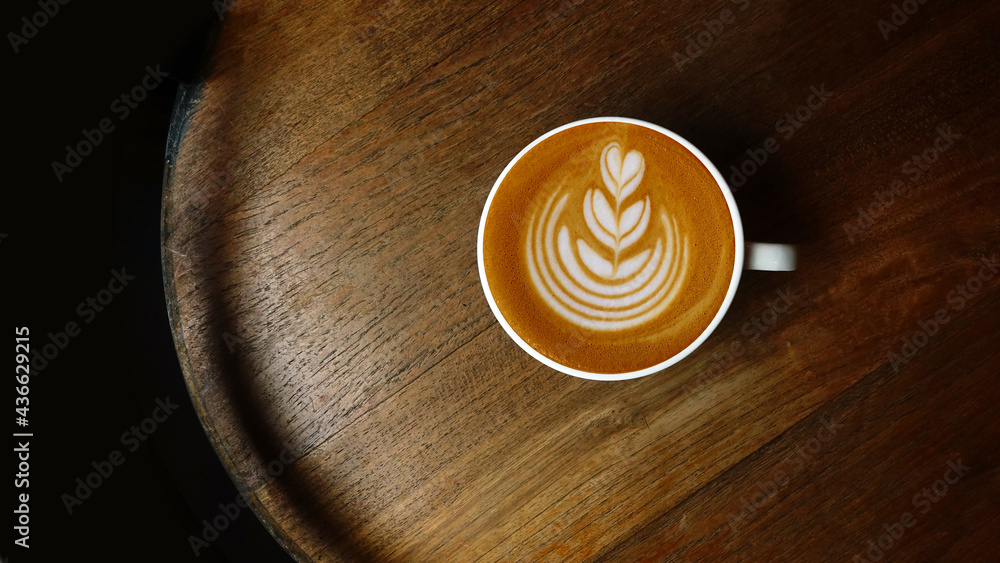 a cup of latte art coffee on wooden background