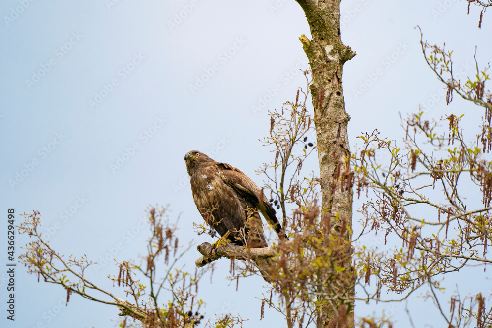 Impressive buzzard, buteo buteo, sitting on a branch in the spring with copy space. Dominant bird of prey is observing on a branch. Feathered animal with white and brown plumage. Blue sky