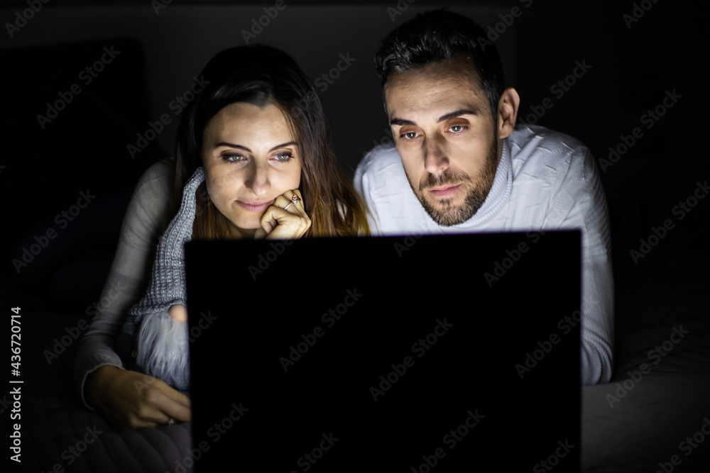 Portrait of a cheerful young couple using laptop computer while laying on bed at night time