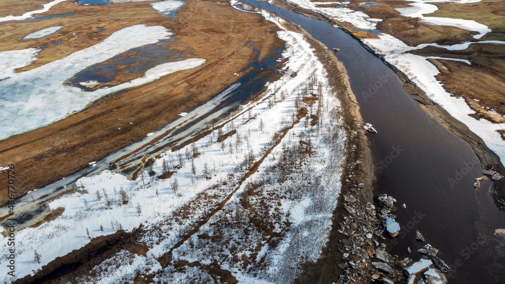 Spring flood, ice floes on the river, Landscape view on the shore of the river floating ice drifting floes on the frozen river early spring floods, aerial view
