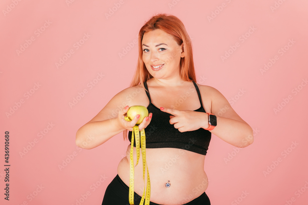 Portrait of beautiful oversized woman wearing sports outfit holding apple