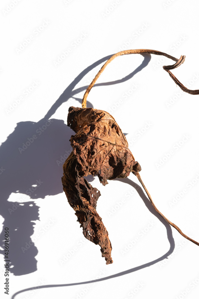 dry brown leaf of a plant lies on a light background on a sunny day.