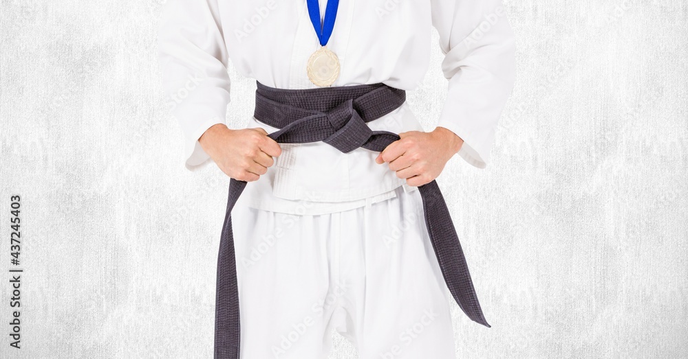 Composition of caucasian martial artist with black belt and gold medal on white background