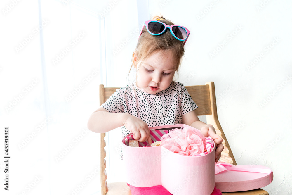 Emotional toddler girl opens a gift. Box in the form of a pink surprise heart.