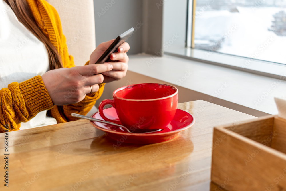 Young woman in orange colored cardigan is reading electronic book on Ebook reader in cafe.