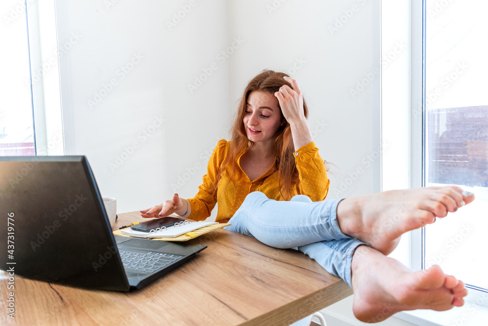Defocus. Young woman is undergoing psychotherapy on the Internet using a computer. Girl looks into a laptop computer.