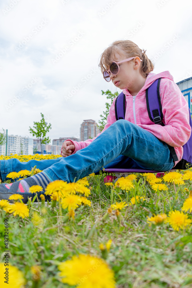 Young girl in jeans and a pink sweater sits on a skateboard in a field with dandelions.