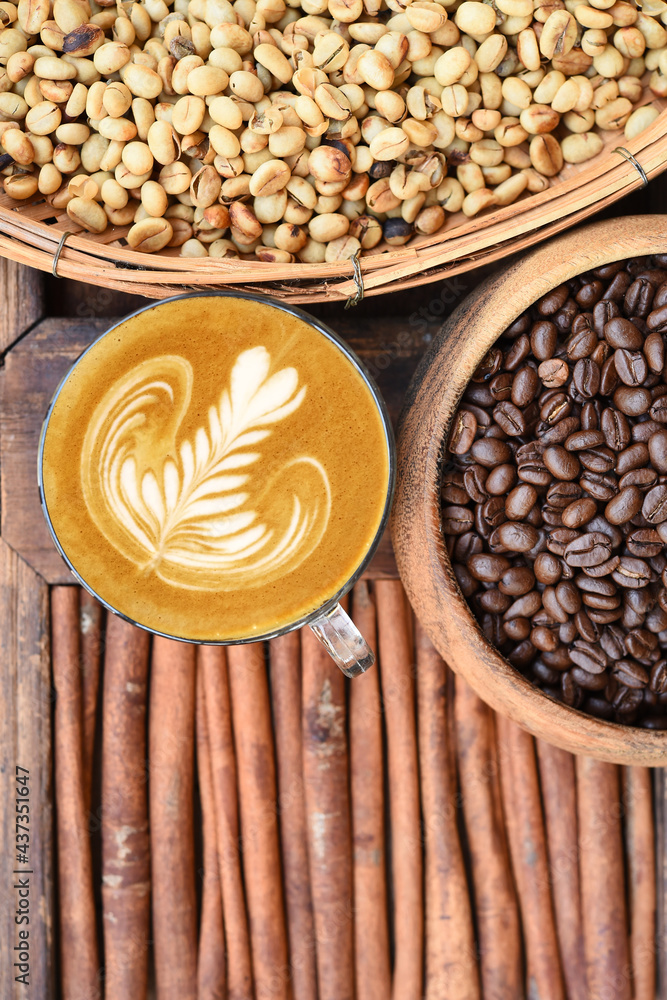 a cup of latte art coffee with coffee beans and cinnamon for background