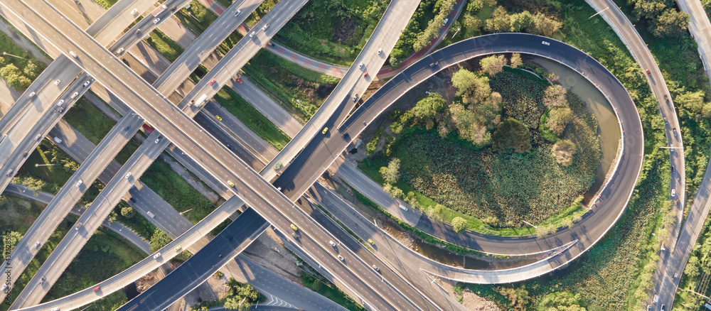 Aerial view of road interchange or highway intersection with busy urban traffic speeding on the road. Junction network of transportation taken by drone.