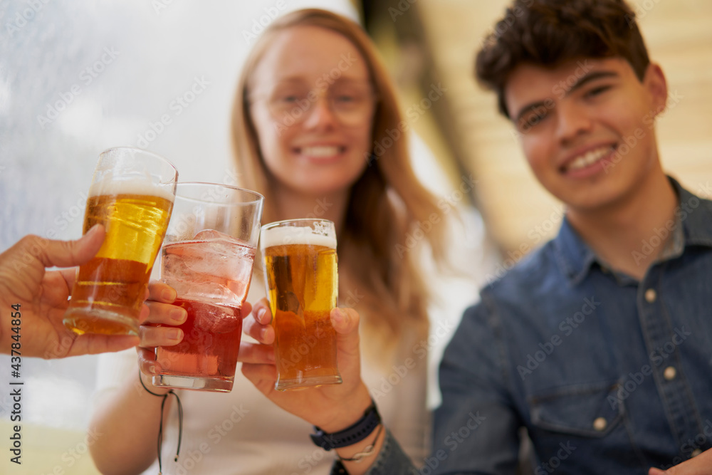 Toast from a group of cheerful multiracial friends sitting on a terrace celebrating with cervesas, having fun during the summer holidays. Celebrations concept