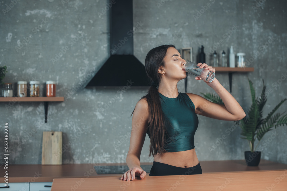 Caucasian woman wearing sportswear is drinking a glass of water to hydrate her body in the kitchen
