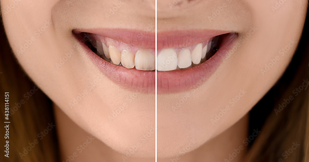 Collage with photos of woman before and after teeth whitening, closeup. Banner design