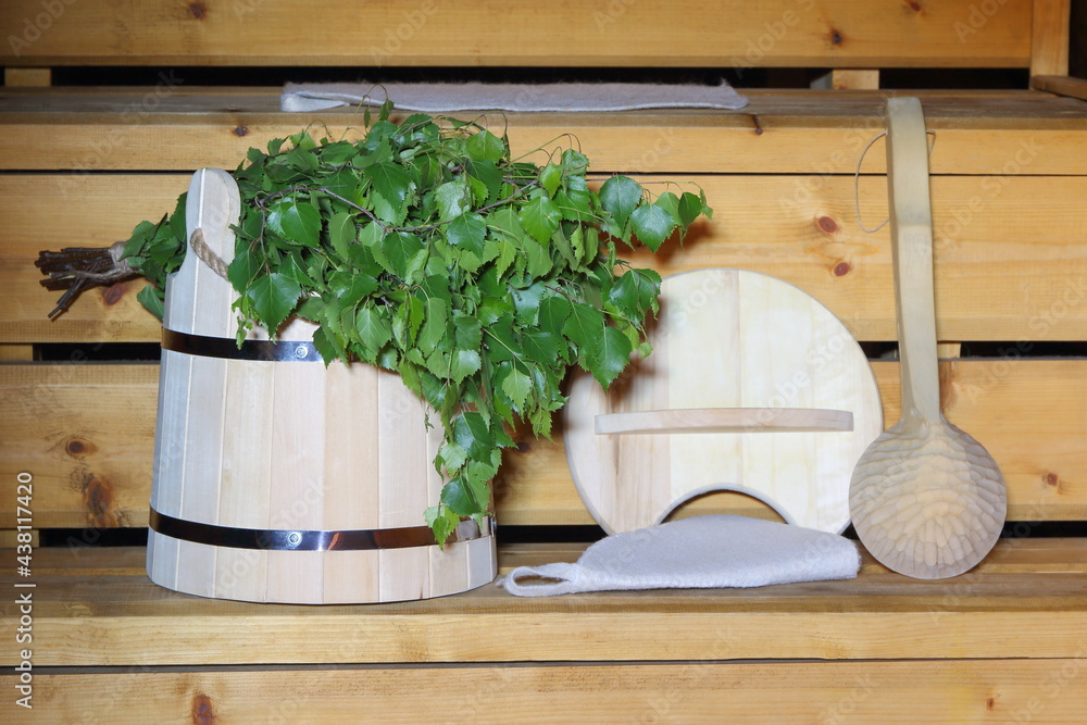 Accessories for sauna and bath treatments and fresh birch broom in an interior of the bathhouse.