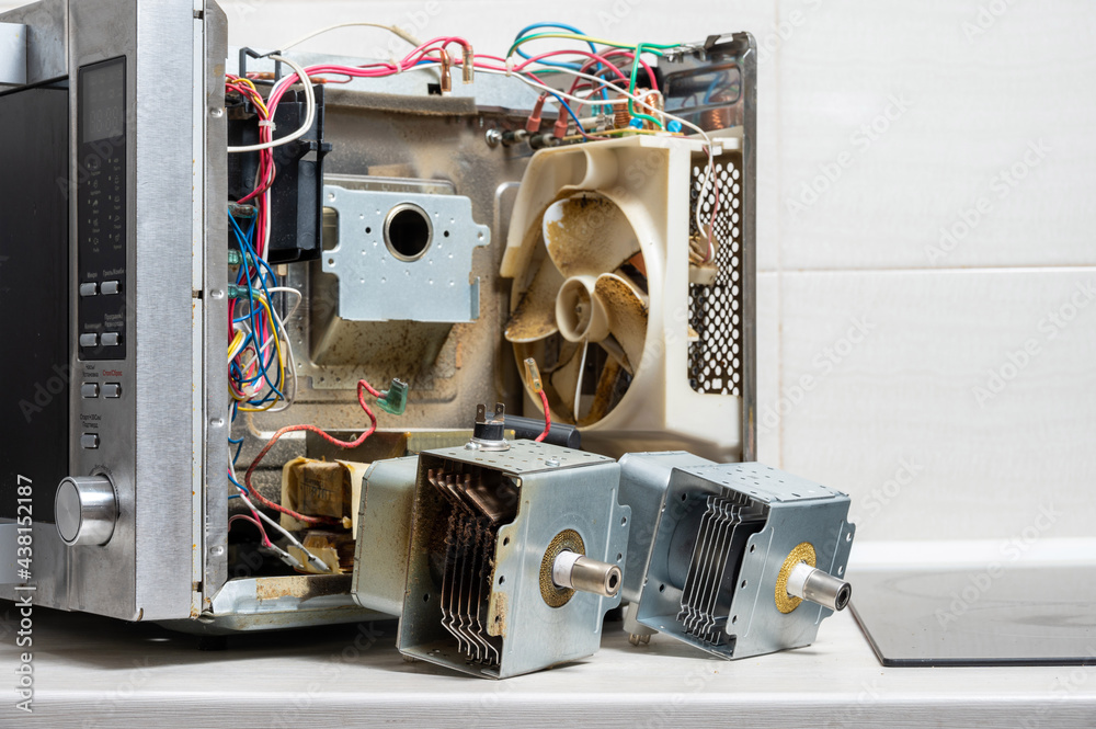 New and old magnetrons next to the disassembled microwave