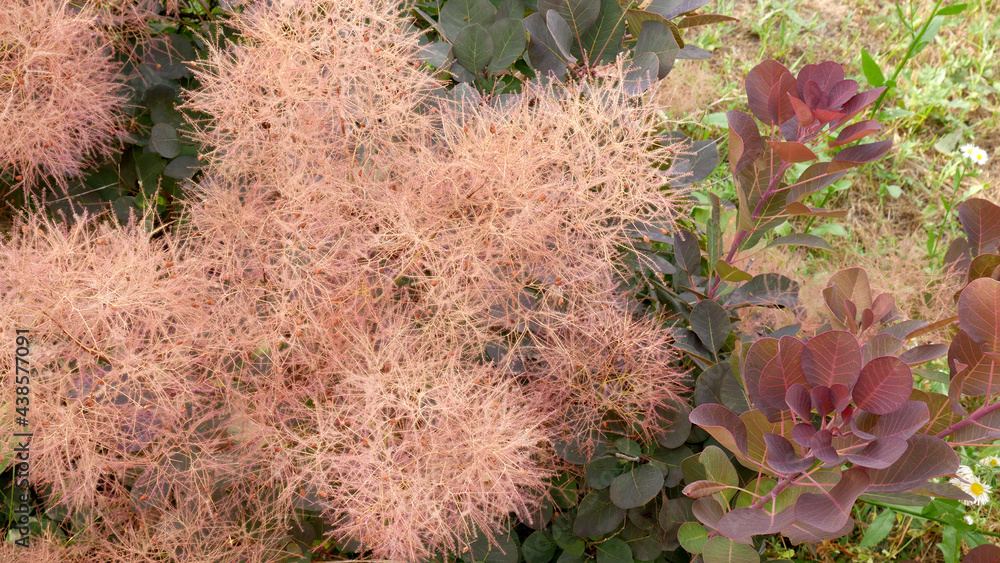 Branch with the dark red leaves and the inflorescences of plant with called Cotinus coggygria of variety Royal Purple.