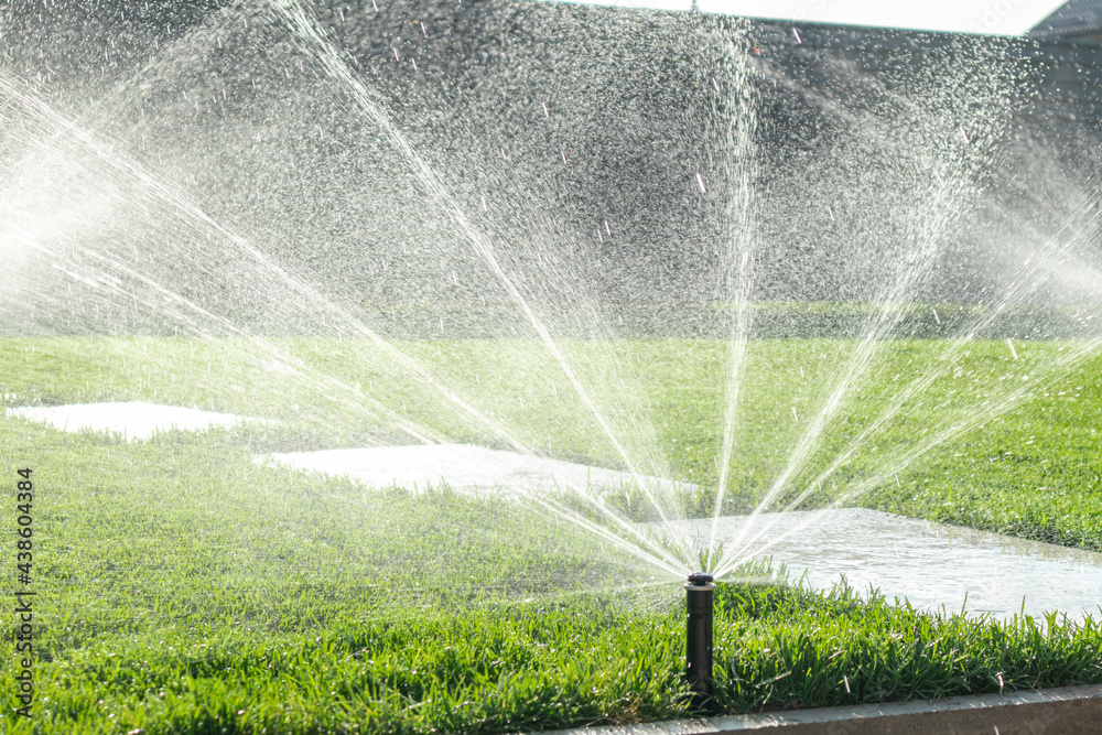 Garden irrigation system lawn. Automatic lawn sprinkler watering green grass. Selective focus.