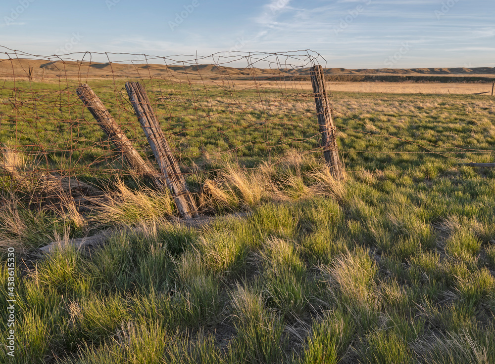 Evening view of an old fence in Grasslands National Park, Saskatchewan, Canada